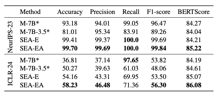 3. ICLR-24数据集中,SEA-EA的准确率超过SEA-E多达4%,进一步表明自我纠正策略的有效性。