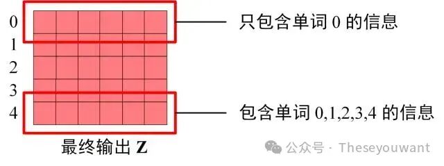 第四步:使用MaskQKᐪ与矩阵V相乘,得到输出Z,则单词 1 的输出向量?1 是只包含单词 1 信息的。