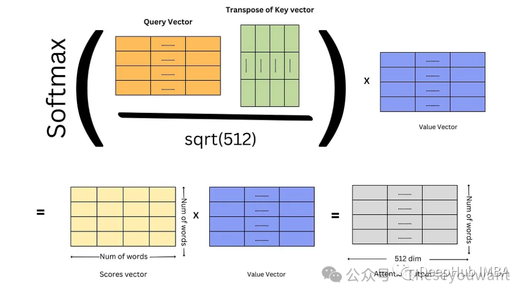 注:X, Q, K, V 的行数表示单词个数。X的列数表示词向量维度。dk是Q,K矩阵的列数,即词向量维度。