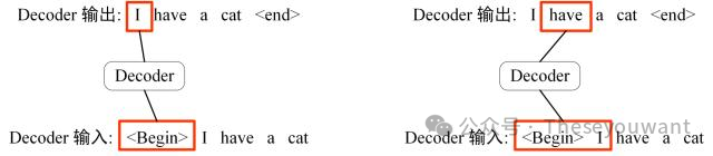下面以"我有一只猫"翻译成"I have a cat"为例,了解一下 Masked 操作。在 Decoder 的时候,是需要根据之前的翻译,求解当前最有可能的翻译,如下图所示。首先根据输入"<Begin>"预测出第一个单词为"I",然后根据输入"<Begin> I"预测下一个单词"have"。