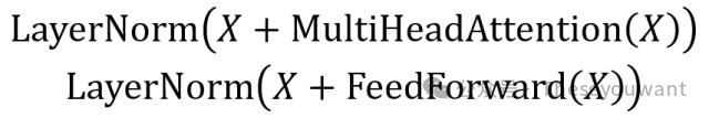 其中: X表示Multi-HeadAttention或者FeedForward的输入,MultiHeadAttention(X)和FeedForward(X)表示输出(输出与输入X维度是一样的,所以可以相加)。 Add指X+MultiHeadAttention(X)残差连接,通常用于解决多层网络训练的问题,可以让网络只关注当前差异的部分。 Norm指Layer Normalization,LN会将每一层神经元的输入都转成均值方差都一样的,这样可以加快收敛。