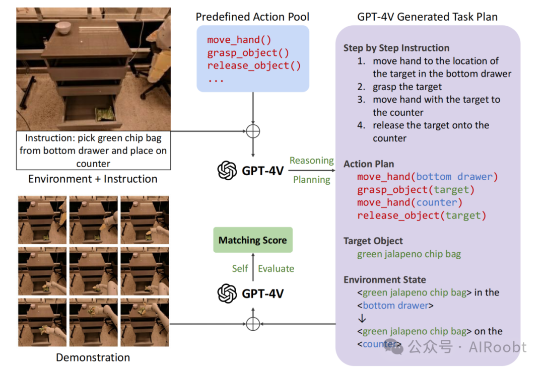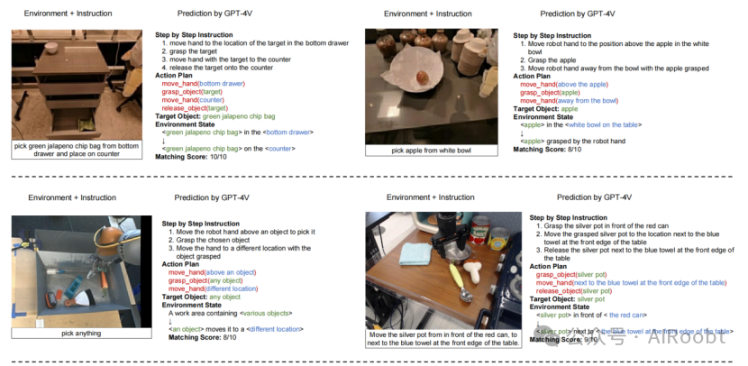 3. 动作选择与序列化:GPT-4V根据分解的任务步骤,选择和排序相应的动作,以形成一个完整的任务计划。这些动作被组织成一个连贯的序列,指导机器人执行任务。