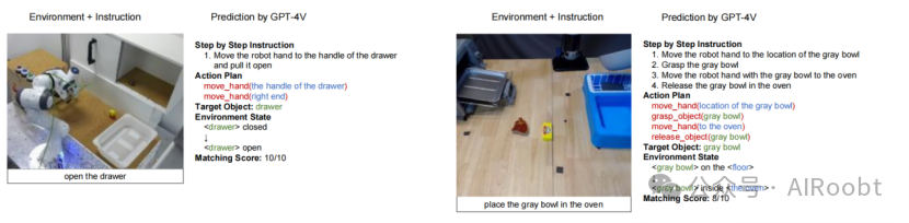 4. 环境和任务评估:在任务计划生成后,GPT-4V会通过“环境状态”对任务计划进行评估。这包括评估任务计划与真实视频演示的匹配程度,并根据计划与视频的一致性进行评分。GPT-4V还会对任务执行后的环境变化进行理解和反馈。