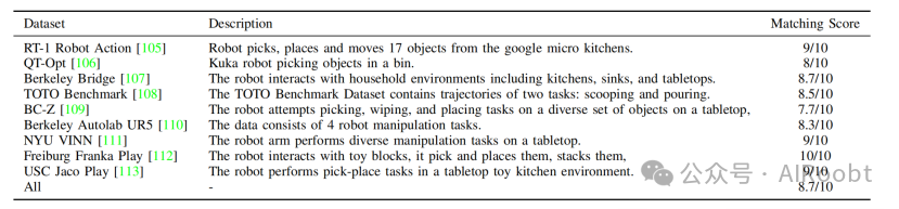 表 I 数据集描述及GPT-4V自评的平均匹配得分,比较其生成的任务计划与九个测试数据集中真实演示的对比情况。