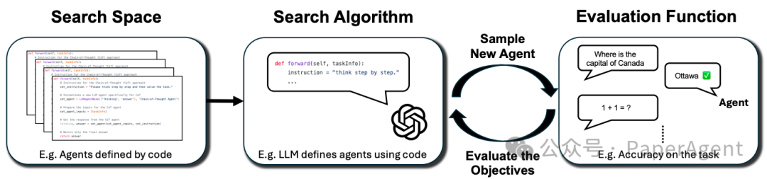 通过代码定义整个智能体系统,并由一个“元Agent”自动发现新的智能体,理论上允许ADAS算法发现任何可能的构建块和智能体系统。