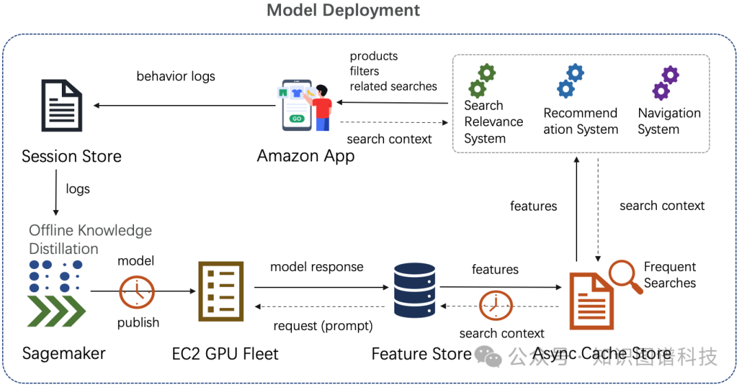 图5 COSMO-LM部署的示意图,展示了异步缓存存储和特征存储作为核心组件。它描绘了用户查询的高效处理和动态每日更新,这对满足亚马逊的搜索延迟要求至关重要。