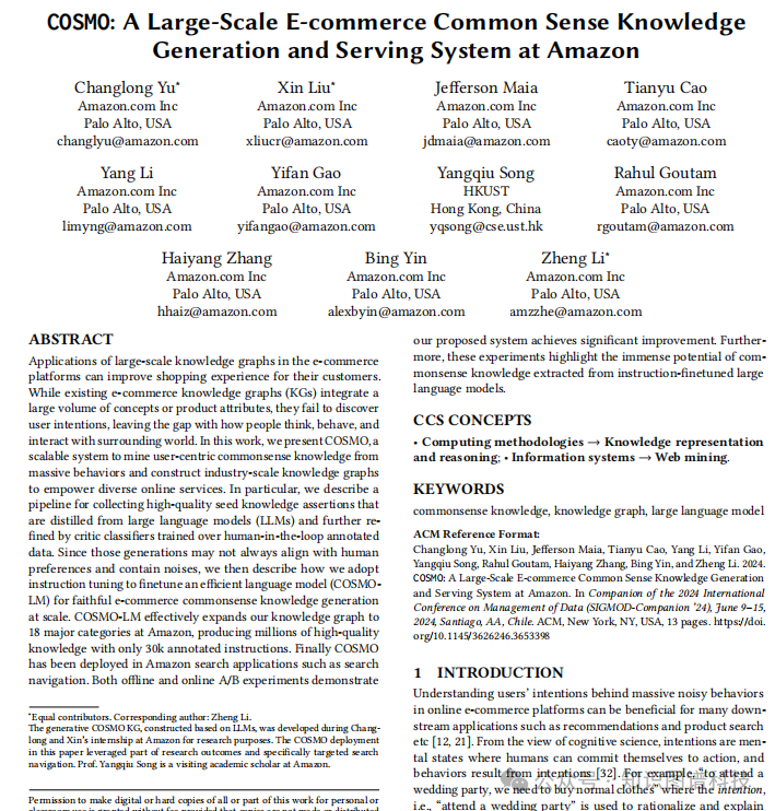 摘要 大型知识图谱在电子商务平台的应用可以改善客户的购物体验。虽然现有的电子商务知识图谱整合了大量的概念或产品属性,但它们未能发现用户意图,导致与人们思考、行为和与周围世界互动的方式之间存在差距。 在这项工作中,亚马逊提出了COSMO,一个可扩展的系统,用于从海量行为中挖掘以用户为中心的常识知识,并构建行业规模的知识图谱,以支持多样化的在线服务。具体而言,本文描述了一个收集高质量种子知识声明的流程,这些声明是从大型语言模型(LLMs)提炼而来的,并通过对人类标注数据进行训练的批评分类器进一步优化。由于这些生成的内容可能并不总是与人类偏好一致,并且可能包含噪声,本文接着描述了如何采用指令微调来对高效的语言模型(COSMO-LM)进行微调,以在规模上生成真实的电子商务常识知识。COSMO-LM有效地将知识图谱扩展到亚马逊的18个主要类别,仅凭30k个标注指令便生成了数百万条高质量知识。 最后,COSMO已在亚马逊搜索应用中部署,如搜索导航。离线和在线的A/B实验都表明我们提出的系统取得了显著的改进。此外,这些实验凸显了从经过指令微调的大型语言模型中提取的常识知识的巨大潜力。 正文 随着我们探索知识图谱在各种应用中的潜力,我们发现了一个大家都非常熟悉的实际应用案例:电子商务!最近亚马逊发表了一篇论文,介绍了如何利用大模型构建常识知识图谱并应用于商品推荐。https://assets.amazon.science/1a/a6/44a84fa24574979b066037b4e20b/cosmo-a-large-scale-e-commerce-common-sense-knowledge-generation-and-serving-system-at-amazon.pdf 在广阔且不断发展的电子商务世界中,为客户提供个性化和相关的产品推荐是一个关键挑战。虽然传统的推荐系统通常依赖历史购买数据和协同过滤,但它们在捕捉许多日常购买决策背后的细微常识知识方面可能会遇到困难。