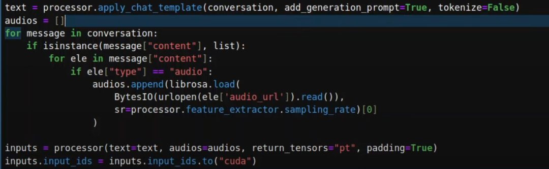 接着我们循环遍历它,使用我之前解释过的Librosa库,将其加载到我们的数组中,然后传递给模型处理器,最后将其加载到GPU中。