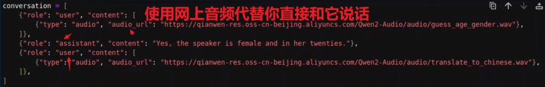 现在让我们指定我们的音频文件并处理它们。如果你看这里,我们正在使用类似ChatML的提示模板。这是一个对话,其中有一个音频文件的URL,然后我们设置了一个提示,表示这是用户、这是助手,然后这是用户的内容。