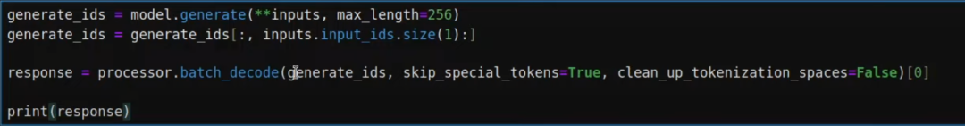接下来,我们将生成的tokens传递给模型,然后模型会生成输出,我们将对其进行解码并打印响应。
