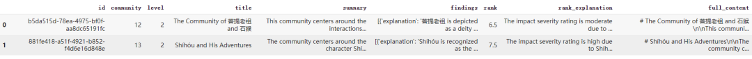columns=["id","community","level","title","summary","findings","rank","rank_explanation","full_content"])