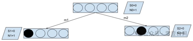 S0是初始状态,我们需要在m1和之间选择下一步行动m2,这将导致状态S1或S2。S1和S2在这里我们计算上限置信界限 (UCB) 值,由于两者都是叶节点,因此两者的值都将为无穷大,因此我们随机选择S1并模拟S1。 由于S1是叶节点且未被访问,我们用随机移动模拟游戏直到叶节点,也就是 S4 区域。发现仅模拟一次并做出 m3 移动 m4,结果是平局,因为这里被隔开了。那么根据游戏规则分配 S4 = 0 并增加访问次数 N4 = 1。然后反向传播,同步到 S1 处。
