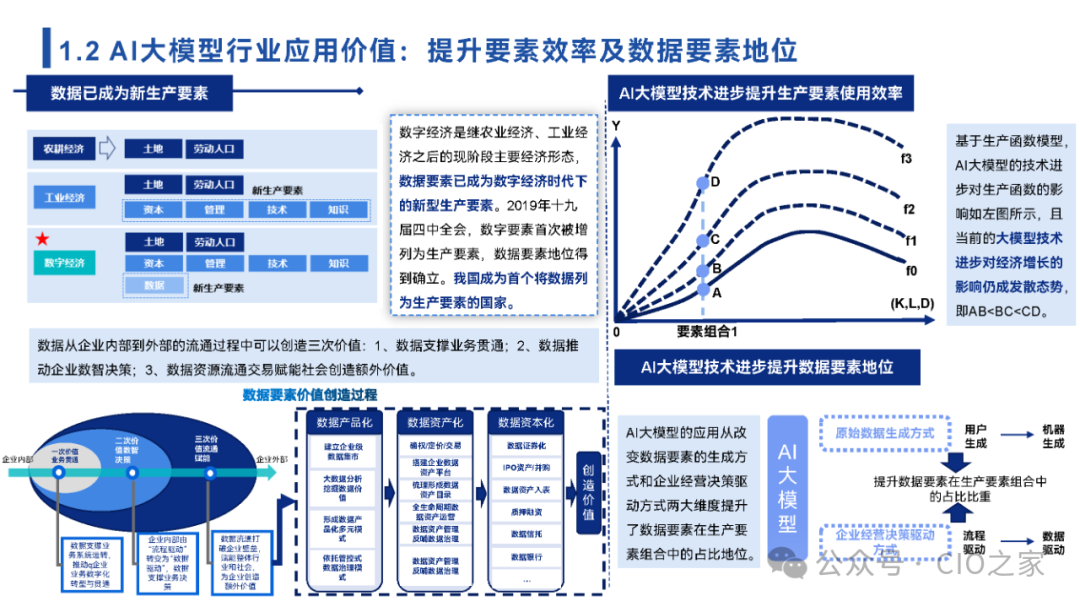 随着人工智能技术的飞速发展,AI大模型成为引领行业变革的引擎。2024年,中国AI大模型行业规模已达到147亿元,展现出巨大的潜力和发展空间。 AI大模型是指拥有大规模参数的神经网络模型,其训练和应用需要大量算力和高质量数据资源。中国AI大模型行业正处于蓬勃发展阶段,市场规模逐年增长,预计到2028年将突破千亿元。AI大模型技术进步能够有效提升生产要素使用效率,并通过改变数据要素的生成方式和企业经营决策驱动方式,提高数据要素在生产要素组合中的地位。数据从企业内部到外部的流通过程中可以创造三次价值:一次价值为数据支撑业务系统运转,推动企业业务数字化转型升级与贯通;二次价值为企业内部由“流程驱动”转变为“数据驱动”,数据支撑业务决策;三次价值为数据流通打破企业壁垒,赋能整体行业和社会,为企业创造额外价值。截至2023年,中国AI大模型在金融、政府、影视游戏和教育领域的渗透率最高,均超过50%。智能客服、智能营销、智能搜索、智能翻译等通用场景应用成熟度较高。此外,AI大模型在医疗、电商、教育和终端设备等领域的应用也日益兴起,展现出巨大的发展潜力。