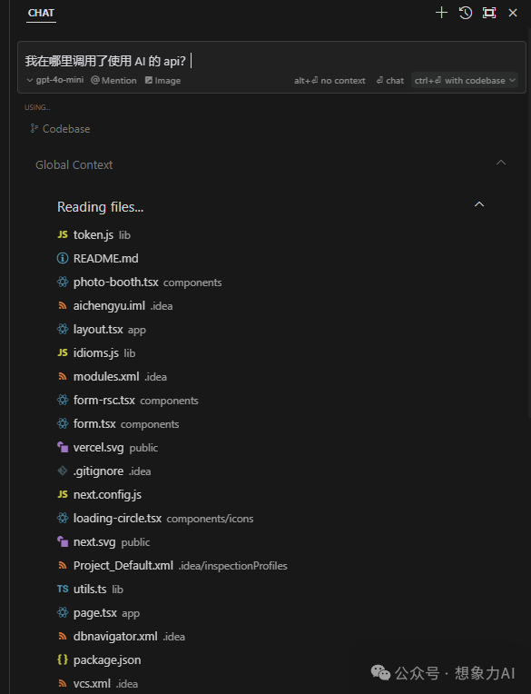 但是有了 cursor,是可以直接跟整个项目中的代码文件问答,试试看: