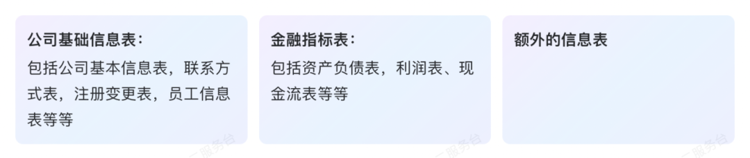 2.合并成多张表数据,包括基本信息表,员工信息表,资产负债表,现金流表,其他信息表等等。
