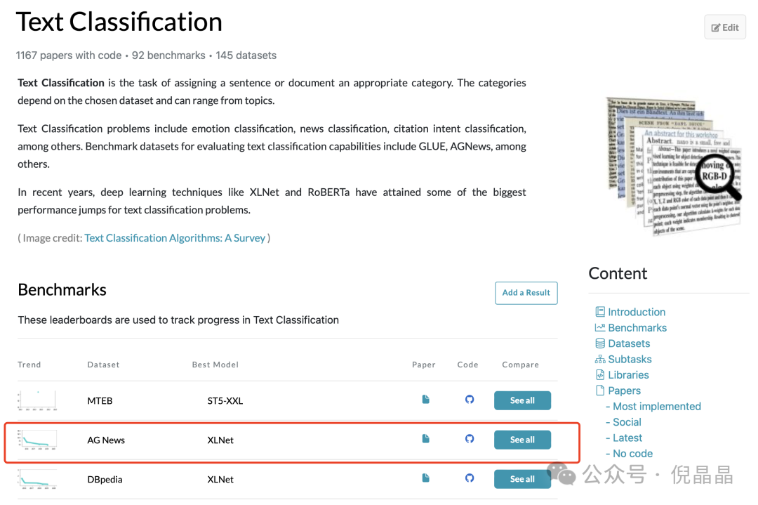 找到 文本分类,看目前的 SOTA 是在哪些数据集上做的,文本分类. https://paperswithcode.com/task/text-classification