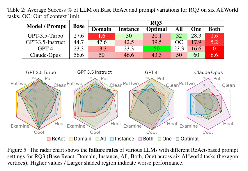 来自亚利桑那州立大学的研究团队引入了一项综合分析来评估 ReAct 框架的说法。ReAct 方法断言,将推理轨迹与动作交织可以增强 LLM 的决策能力。研究人员使用不同的模型(包括 GPT-3.5-turbo、GPT-3.5-instruct、GPT-4 和 Claude-Opus)在一个称为 AlfWorld 的模拟环境中进行了实验。通过系统地改变输入 prompt,他们旨在确定 ReAct 方法带来的性能改进的真正来源。