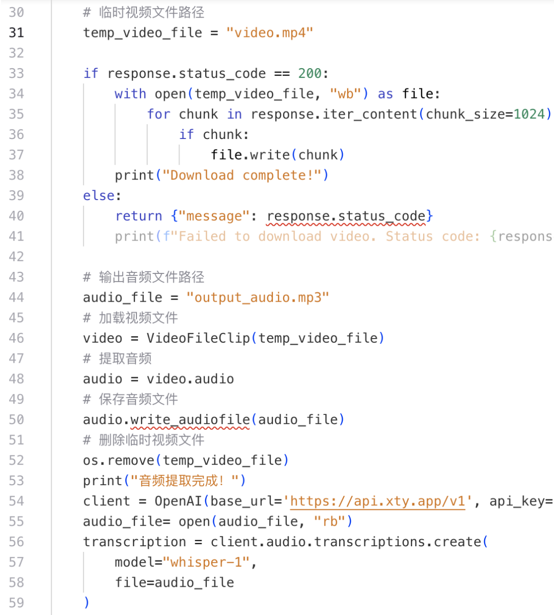 这里只提取了视频字幕。分两小步,先分离视频中的音频,再调用ASR语音识别技术,将音频转成文本。 这两步虽然在扣子中都有对应的插件,但我试了下没成功。就自己动手开发了一个插件。
