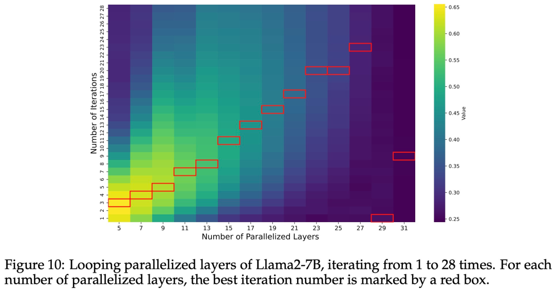 对于大多数经过「改造」的模型,在面对抽象推理(ARC)或数学推理(GSM8K)基准测试时,它们往往显示出最陡峭的下降趋势。 这一现象可能源于逐步推理任务对于模型层级顺序的敏感度远高于那些主要依赖语义理解的常识性任务。 与那些仅通过理解语义便能完成的任务不同,推理任务要求模型同时把握结构与含义。 这种观察与模型在单次处理过程中可能进行一定程度的顺序依赖性推理的假设相吻合。 研究者使用了一个比喻来说明:如果画一幅由许多不同元素组成的拼贴画,那么画的顺序可能不那么重要;但如果是要画一幅精确的建筑场景,那么每一笔的顺序就变得非常重要了。 据此,研究者得出了结论:数学和推理任务对模型层的顺序具有更高的依赖性,而对于那些主要依赖语义理解的任务,顺序的影响则相对较小。 沿用上一节中画画的的比喻,当画家在画一幅画时,不是一开始就画所有东西,而是先画一部分,比如车身,然后再根据这部分来添加其他的东西,比如车轮。 在 AI 模型中,层就是所谓的画家,处理信息就是在画画,如果先得到了正确的信息,也就先画出了所谓的车身,那么它们就能更好地完成自己的工作,为画作添加车轮。 对于 transformer 而言,当给予适当的输入时,层可能只在前向传播中做出贡献,并非通过残差连接「传递」输入。 如果情况确实如此,那么迭代上一个实验中的并行层应该比单次执行并行层更能提高模型的性能。 基于此,研究者通过将并行层的平均输出反馈到同一层中进行固定次数的迭代来测试这一点。 图 9 展示了将并行层循环 3 次的结果。循环并行 3 次的结果显著优于单次迭代(并行层)。 起始层 N 设定为 15(针对 Llama2-7B 模型)或 11(针对 BERT 模型)时,即处于每种情况的极左端点,仅有单一的层级受到影响。 在这种特定情况下,三次循环并行的效果等同于单纯地将中间层重复三次。与此同时,对于这一点上的并行层而言,其性能与完整模型无异。研究者们还针对不同的迭代次数重复了相同的实验。图 10 展示了 Llama2-7B 的性能随并行化层数 M 和迭代次数的变化情况。每个 M 的最高性能迭代次数用红框标出。 除了 M=29 和 M=31(几乎并行化所有层)外,最佳迭代次数大致与并行化层数成线性比例。 因此,研究者得出的结论是:最佳迭代次数与并行化层数成正比。 最后,在图 11 中,研究者们将所有实验中对 Transformer 的「改造」进行了比较,在一个图表上显示了所有基准测试的中位数或平均性。中间重复 —— 用相同数量的中间层副本替换中间层 —— 表现最差, 很快就降到了随机基线的性能。相反,循环并行和随机层顺序的影响最小。 因此,研究者得出的结论是:重复单一层的影响最严重。随机化层顺序和循环并行的影响最小。 这些实验整体上显示出平缓的性能下降,但研究者仍然不清楚为什么这些层在大多数扰动下还能保持一定的稳健性,这个问题还需在未来的研究中进一步探讨。 更多细节请参见原论文:https://arxiv.org/pdf/2407.09298v1 ✅我是丁师兄,专注于智能驾驶大模型,持续分享LLM面试干货。