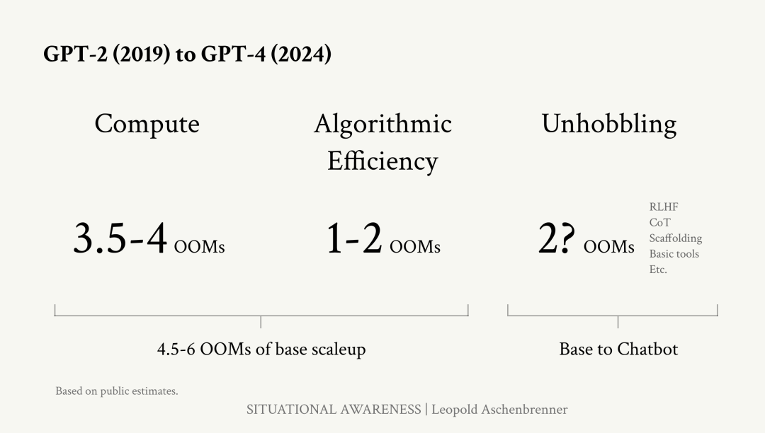 他说有三个要素:一是芯片的算力(Compute);二是算法的效率(Algorithmic Efficiency);三是工程化(Unhobbling),比如 RLHF、CoT、Scafolding 等技术(篇幅有限,不做介绍)。
