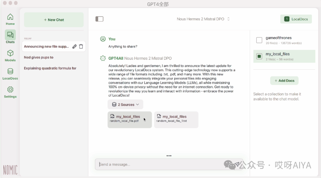 跨平台兼容:无论是 Windows、macOS、Ubuntu,GPT4All 都能完美适配,让你的聊天随时随地触手可及。