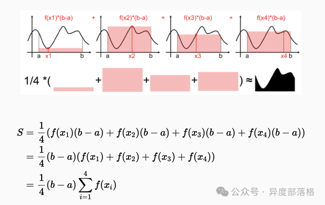 蒙特卡罗方法的解法如下:在[a, b]之间取一个随机数 x,用 f(x)⋅(b−a) 来估计阴影部分的面积。为了提高估计精度,可以取多个随机数 x,然后取这些估计值的平均值作为最终结果。