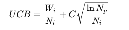 1. 选择(Selection):从根节点开始,按照最大化某种启发式价值选择子节点,直到到达叶子节点。使用上置信区间算法(UCB)选择子节点。