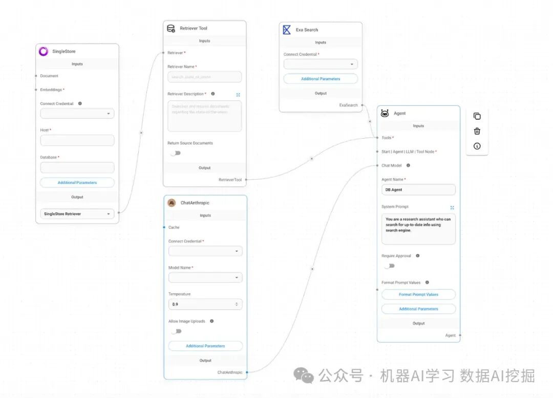 以下是一个典型代理的简单图示,该代理拥有Anthropic LLM作为智能源,一个exas-search和一个连接到SingleStore的检索器作为工具(用于访问),并通过检索器工具访问知识。