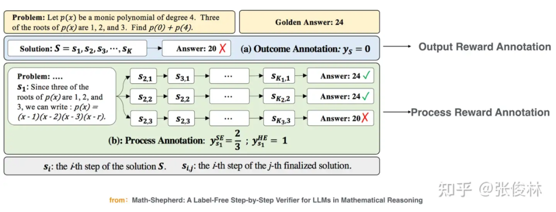 PRM的含义是训练一个模型,能对中间每个过程都给予反馈信号,这样在推导过程中错在哪个步骤就很清楚,不用等到最后,所以它的特点是反馈信号丰富不稀疏。但问题来了,要训练PRM就需要有每一步有标注的数据,这么多标注信号怎么来?常规做法是靠人工标注,比如去年很火的OpenAI的PRM工作“Let’s Verify Step by Step”,就是靠人工标注了80万中间步骤反馈信号的数学题推导过程,而且证明了PRM效果要比ORM好。所以,PRM的优点是反馈多效果好,但是训练数据制作成本太高,一般人做不了。