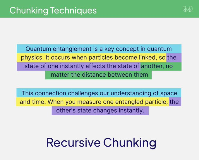 • 方法:先用主要分隔符(如段落)分割,如果块太大,再用次要分隔符(如句子)递归分割。
