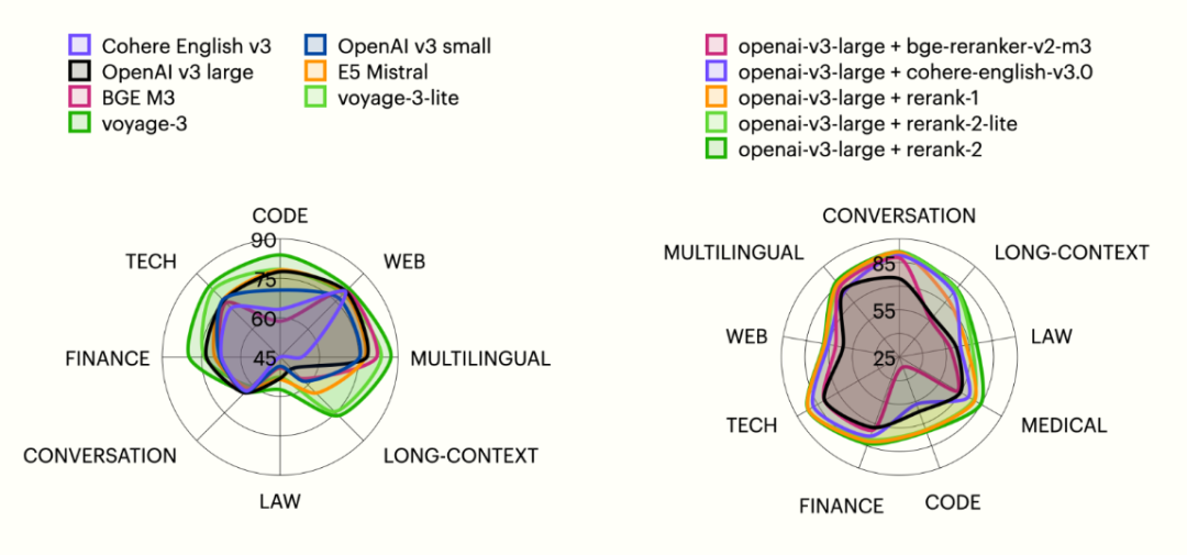 左图:不同嵌入模型在不同数据领域的 NDCG@10。右图:在 OpenAI 最新嵌入模型上使用时各种重新排序器的 NDCG@10。 这一创新对于企业级应用尤其关键,因为在大量数据查询中,信息的相关性决定了AI系统能否高效辅助决策。通过这些新型模型,Voyage AI帮助企业实现了更加精准的数据检索和分析,显著提升了AI系统的商业价值。 这些技术不仅解决了企业在大规模数据处理中的痛点,还为复杂应用场景中的AI系统提供了可靠的支持,尤其在对速度、成本和准确度要求高的行业,如金融、法律、医疗和多语言处理领域,Voyage AI的技术具有极大的应用潜力。 目前,Voyage AI通过与Snowflake、Harvey、Databricks等知名企业的合作,Voyage AI在实际应用场景中获得了宝贵反馈,这些反馈进一步帮助他们优化产品,确保模型在真实商业环境中保持高效性能。 |