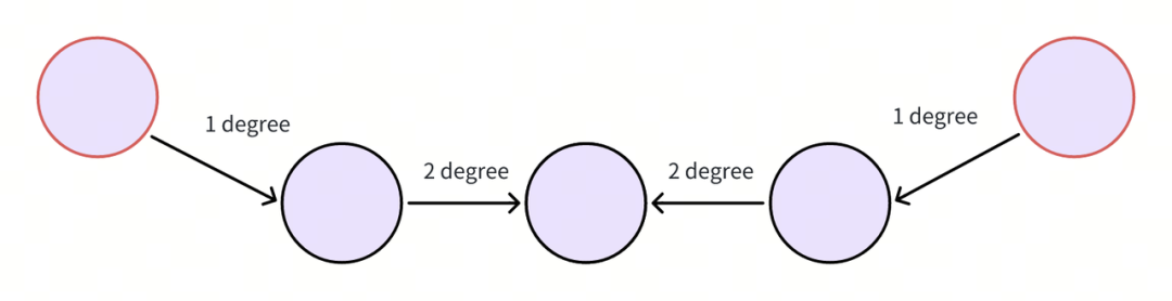 基于跳数有限性,我们仅需要扩大较小的度数(如1,2等),就能涵盖大部分可能有助回答的 relationships。请注意,这一步扩展的度数的概念和回答问题总共需要的跳度的概念不同。比如,如果回答一个 query 问题涉及两个相差 n 跳的 entities,那么实际上往往只需要扩展 ⌈n / 2⌉ 度就可以,因为这两个 entities 是被向量相似召回后的两个起始端点。如图,向量召回到了两个红色的 entities,只需要从它们开始,相向扩展 2 度,就能覆盖到 4 度的跳数,这足以回答涉及到这两个 entities 的 4 跳问题。
