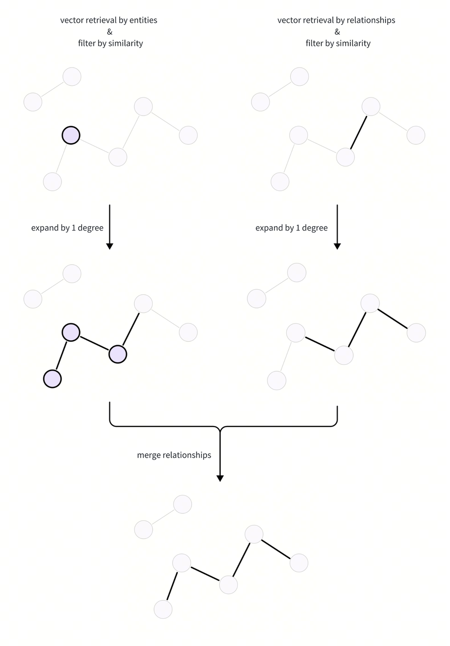 基于这两点观察,我们发现,有限次数的在知识图谱内的路由查找过程,只涉及到局部的知识图谱信息。因此,将query 进行知识图谱内信息检索的过程可以用下面这两步来实现:- 路由的起点,可以通过向量相似性查找来完成。可以涉及到 query 与 entities 或 query 与 relationships 的相似度关系查找。