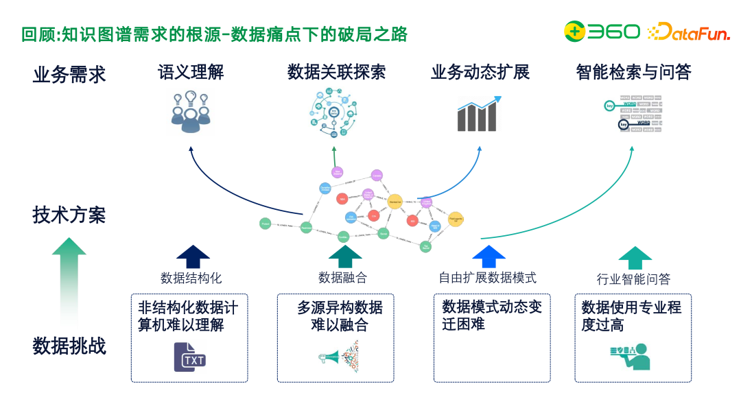 知识图谱需求的根源在于一系列数据挑战,比如非结构化数据计算机难以理解、多源异构数据难以融合、数据模式动态变迁困难、数据使用专业程度过高、数据高度重复性等。