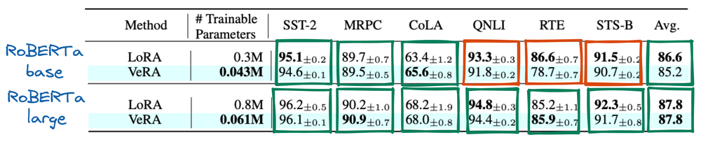 虽然 VeRA 与 LoRA 之间的性能差异并不显著,但可训练参数总量的下降非常明显,相比 LoRA, VeRA 的训练参数仅为前者的 1/100。