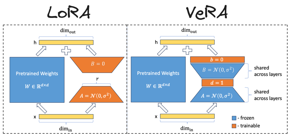 VeRA(Vector-based Random Matrix Adaptation,基于向量的随机矩阵适应)技术可以进一步减少 LoRA 中可训练参数数量,同时能够匹配或接近 LoRA 的精度。