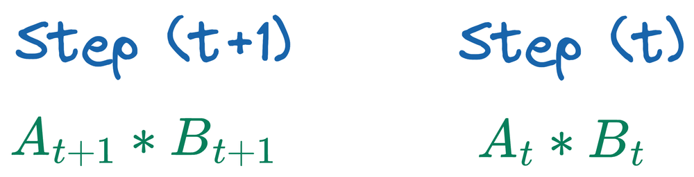 为简化起见,考虑以下步骤 t+1 和 t 所示的低秩矩阵乘积: