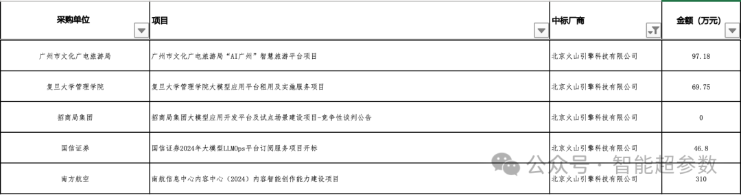 2024年1-9月份,智能超参数统计到的火山引擎中标项目为6个,中标项目披露的中标金额为523.73万元。6个中标项目,客户的行业分布比较分散,场景上以大模型应用平台为主。