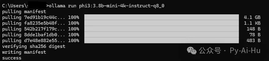 安装完成后,打开命令提示符以确认安装已完成,输入“ollama --version”并按Enter键,当显示“ollama version is 0.3.8”时,表示安装完成。 显示的版本可能会有所不同,具体取决于您下载的安装程序。 安装 Phi-3 最后,安装Phi-3。从命令提示符安装 Phi-3。 检查完Ollama的版本后,请输入 请确认显示以下屏幕并显示“成功”。