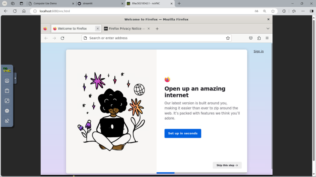 因为目前Computer use 还处于实验阶段,考虑到安全性问题,官方的demo示例是专门为 Linux 系统设计的,暂时不适用于 Windows。根据官方文档,首先拉取并运行Docker容器: exportANTHROPIC_API_KEY=%your_api_key%dockerrun\-eANTHROPIC_API_KEY=$ANTHROPIC_API_KEY\-v$HOME/.anthropic:/home/computeruse/.anthropic\-p5900:5900\-p8501:8501\-p6080:6080\-p8080:8080\-itghcr.io/anthropics/anthropic-quickstarts:computer-use-demo-latest