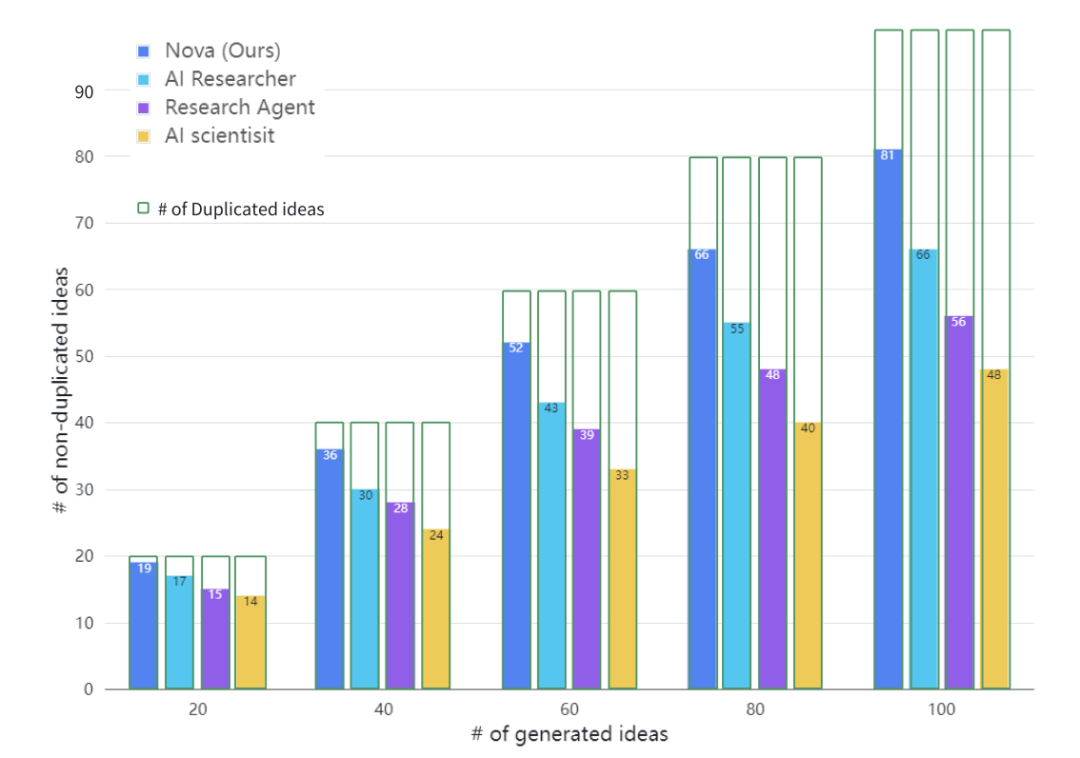 多样性方面,研究团队通过计算idea之间的相似度来对生成的idea来进行去重。实验中,随着生成的想法数量的增加,Nova 模型可以通过迭代规划和搜索不断产生新的想法。在非重复百分比方面,Nova 的表现明显优于其他方法,超过80%的想法都是不重复的。