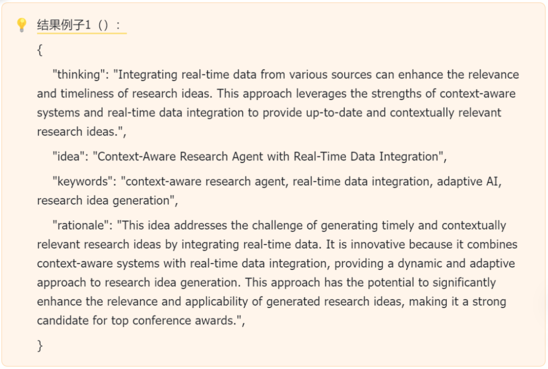 综合以上方法,当Nova拿到一篇文章后,就能自动化的去想如何提出好的idea来提升当前文章里提到的方法。 比如,下面的idea是当团队把微软的Research Agent原始paper作为输入得到的优化方法,它能自动分析当前方法没有接入实时的数据流的缺陷,并提出方案去解决这个问题,具有较强的创新性。