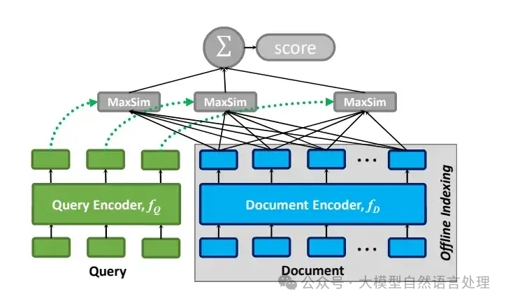 编码器将查询和文档转换为token级别的embedding列表和。然后,后期交互阶段使用针对每个中的向量,找与其产生最大内积的中的向量(即为向量之间的相似性),并将所有分数求和的最大相似性 (MaxSim) 计算。MaxSim的计算结果就反映了查询与文档之间的相关性分数,表示为。