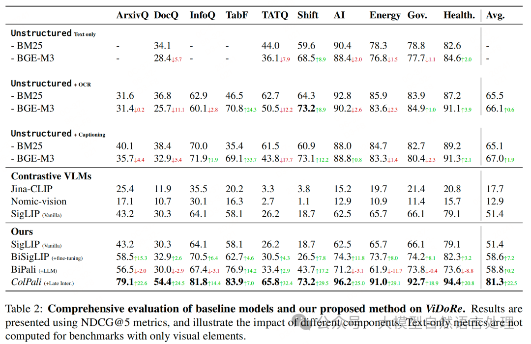 通过这种方式,ColPali能够在检索时充分利用查询和文档之间的交互,同时保持了离线计算和快速查询匹配的优势