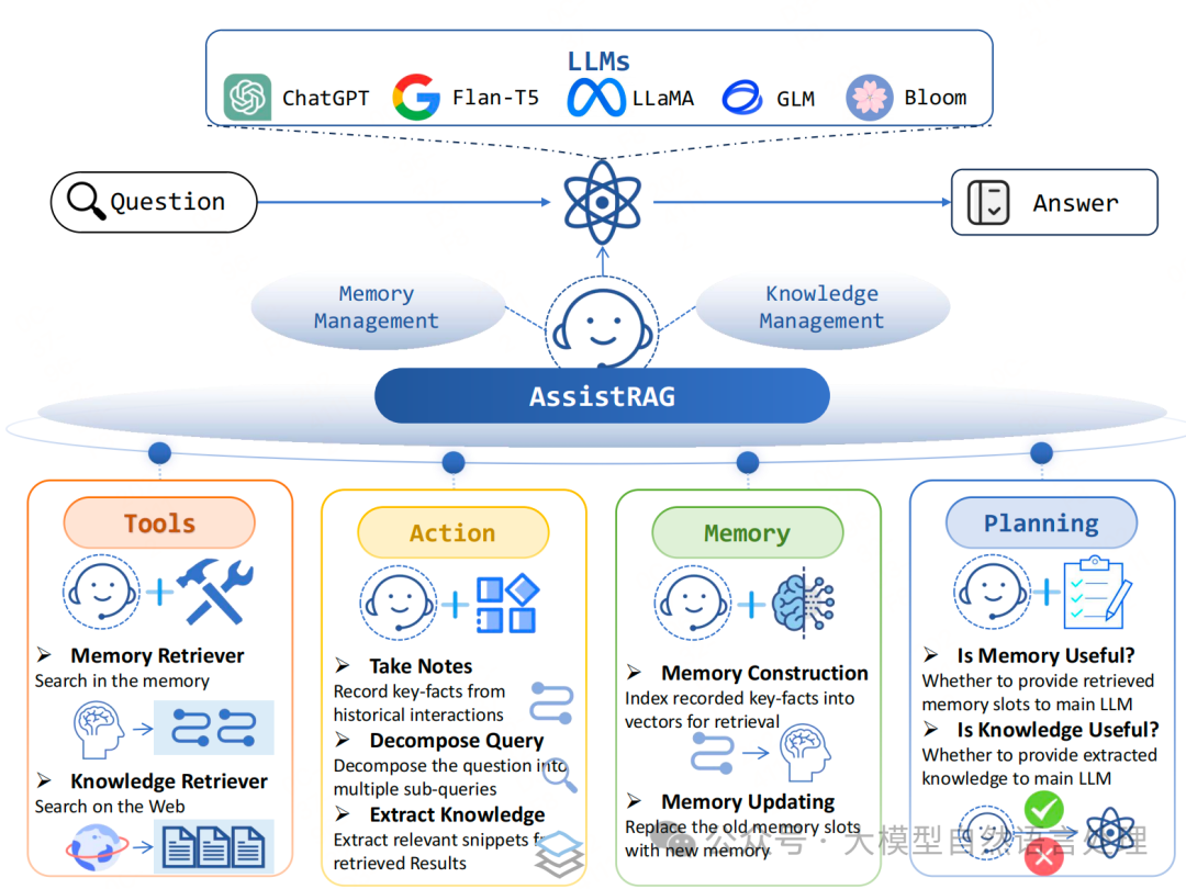 可以看出,相比之前的RAG,该框架主要创新点是引入一个Assistant LLM,下面详细看下助手语言模型功能。 2. AssisTRAG AssisTRAG主要分为两个类别来处理复杂任务:记忆管理和知识管理。记忆管理涉及整合和分析来自内部内存的内容,而知识管理则侧重于利用外部知识。这两个主要功能由AssisTRAG的四个核心能力支持: - 工具使用(Tool Usage):从内部记忆和外部知识库中检索相关信息。