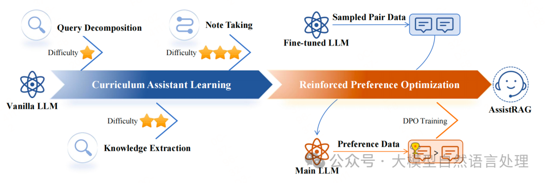 2.3 AssisTRAG 训练 AssisTRAG 的训练过程分为课程助理学习和强化偏好优化两个阶段。课程学习阶段通过逐步增加任务复杂性来提升助手在 RAG 过程中的技能。强化偏好优化阶段则通过根据主 LLM 的反馈调整助手的输出,确保助手提供的帮助更加贴合主 LLM 的需求。 2.4 AssisTRAG 推理AssisTRAG 通过三个步骤启动其推理过程: 1. 信息检索与整合在这个初始阶段,AssisTRAG 首先激活 Action II 来理解主 LLM 的信息需求。然后,它使用 Tool I 和 Tool II 分别从内部记忆和外部知识库中检索相关信息。接着,它调用 Action III 从检索到的文档中提取关键知识。 2. 决策在这一阶段,AssisTRAG 决定是否将检索到的记忆和提取的知识提供给主 LLM。它激活 Plan I 和 Plan II 来评估这些检索到的记忆和知识对当前问题的相关性和有用性。如果助手认为这些信息有帮助,它们将被提供给主 LLM 以辅助回答生成。 3. 回答生成与记忆更新在最后阶段,AssisTRAG 提示主 LLM 根据问题、其内部知识和助手提供的信息生成答案。之后,AssisTRAG 激活 Action I,利用其笔记功能,捕捉交互中的关键推理步骤并将其纳入其记忆中。这确保了助手的知识库保持最新。 实验效果