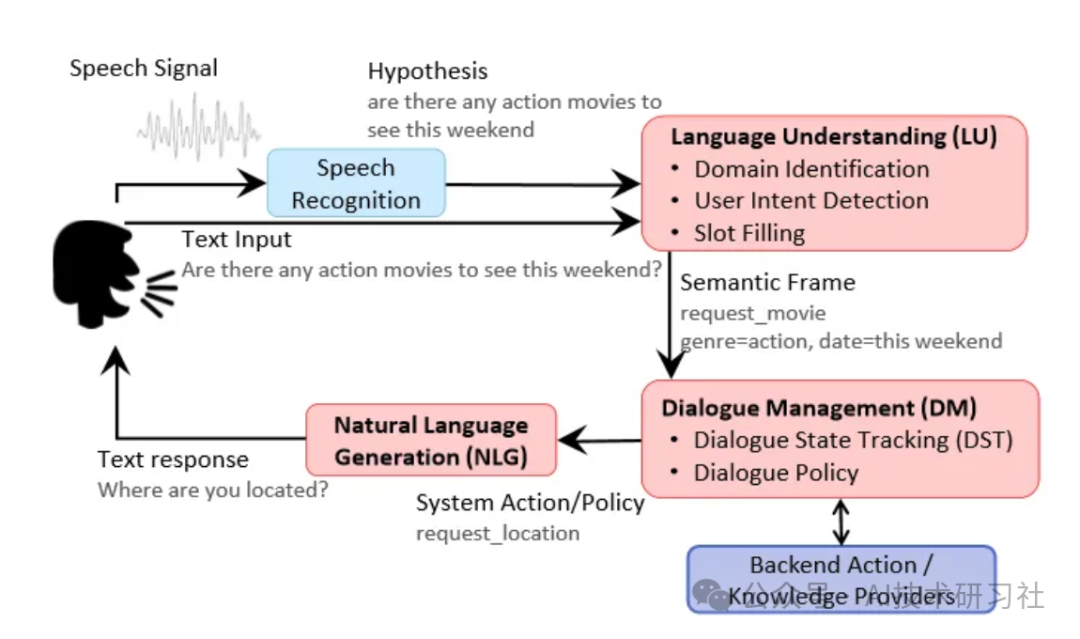 3. 对话管理模块(DM):根据用户的意图和槽位信息,决定下一步的操作。这个模块的主要任务是管理对话流程,判断系统需要提供什么信息或采取什么行动。