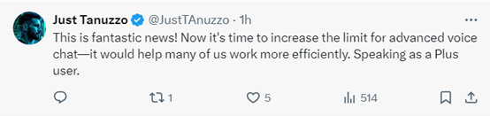 网友表示,非常棒的消息!现在是时候提高高级语音聊天的限制了——这将帮助我们许多人更高效地工作。