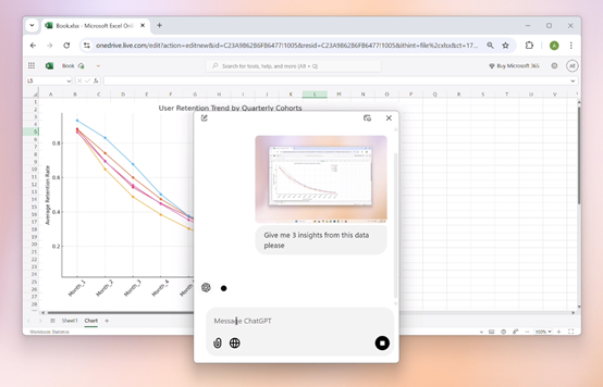 也可以在工作区域进行截图,这个就非常方便了。例如,你正在分析一个数据表,可以通过截图功能让ChatGPT基于这个数据给你三个不同的见解。