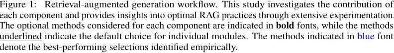 检索增强生成(RAG)技术在整合最新信息、减轻幻觉以及提升响应质量方面表现出色,特别是在专业领域。尽管许多RAG方法被提出以通过查询依赖检索来增强大型语言模型,但这些方法仍面临复杂的实施和较长的响应时间问题。通常,RAG工作流涉及多个处理步骤,每个步骤可以通过不同的方式执行。本文探讨了现有的RAG方法及其潜在组合,以确定最佳RAG实践。通过大量实验,提出了一些部署RAG的策略,以平衡性能和效率。此外,还展示了多模态检索技术如何显著提高关于视觉输入的问题解答能力,并通过“检索即生成”策略加速多模态内容的生成。资源可在此处获取。